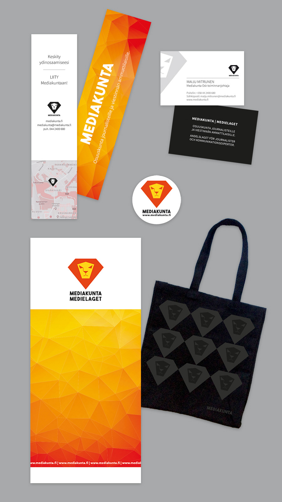 Visual design and laying it out. Bookmark, Business card, Sticker, Roll up and Bag, Mediakunta Osk.